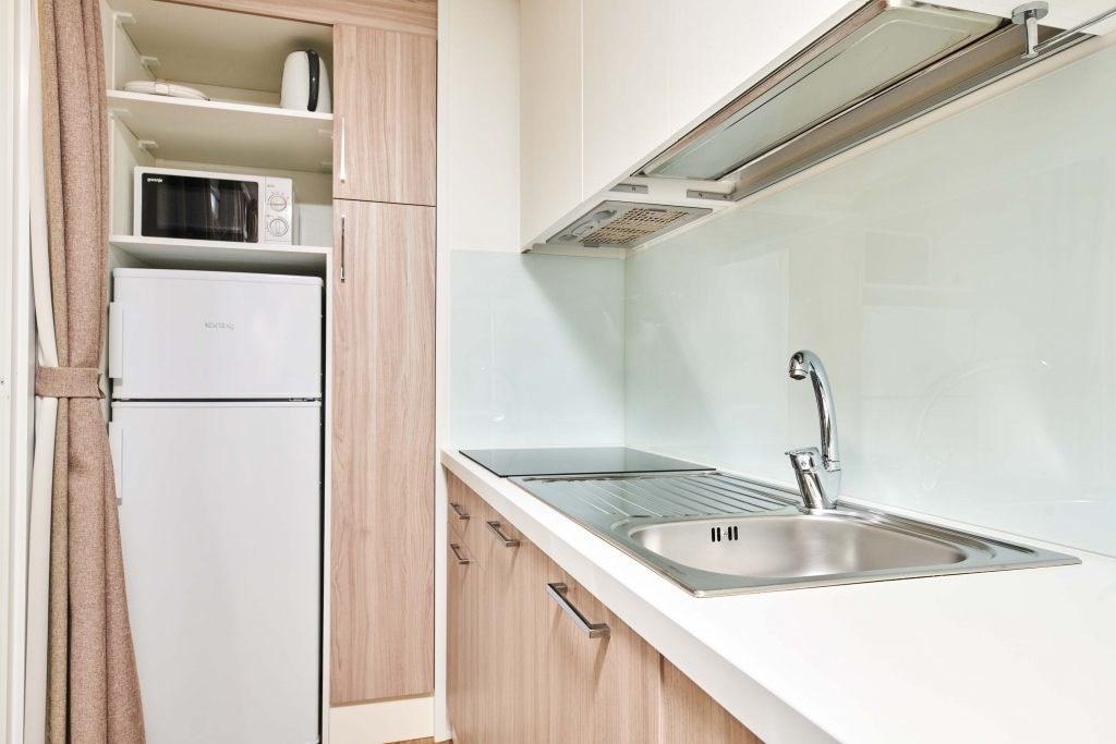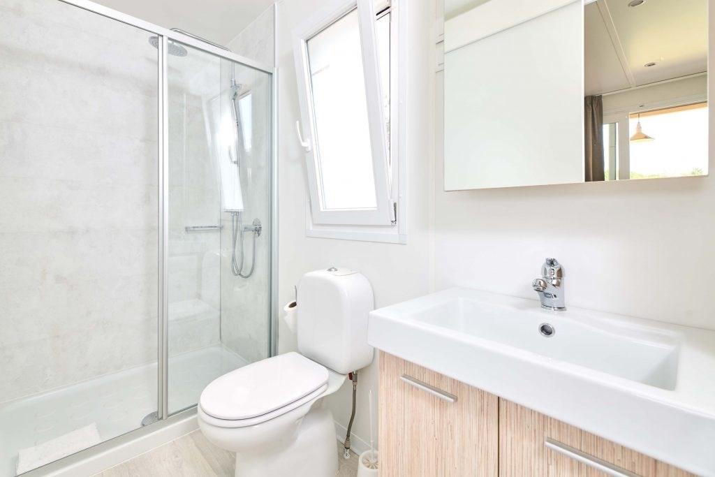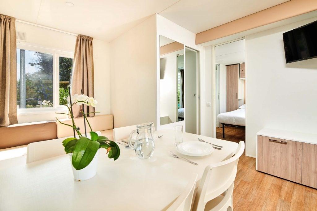 klimatizované mobilní domky - typ M. HOME 4(+2) Classic - cca 24 m2 - dvě 2lůžkové ložnice (jedna s manželskou postelí a druhá s oddělenými lůžky), denní místnost s možností přistýlky formou rozkládacího gauče pro max. 2 děti do 12 let, vybavený kuchyň. kout, koupelna s WC, SAT TV, Wi-Fi, krytá terasa se zahradním nábytkem a lehátky. |