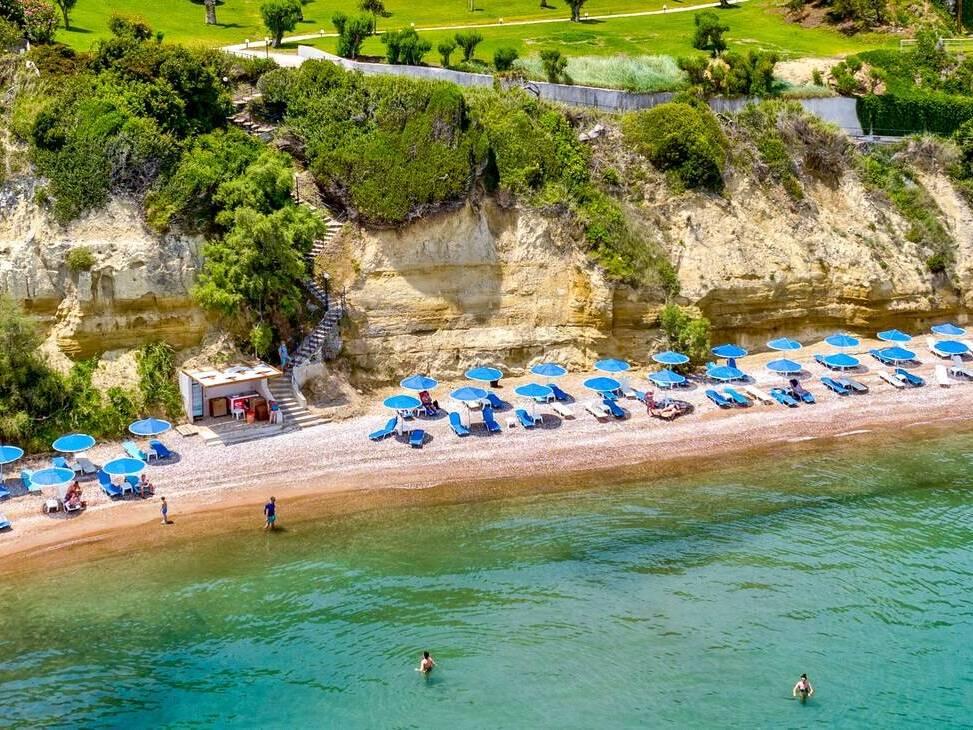 Piesočnato-kamienková pláž vzdialená asi 50 m od hotela, na