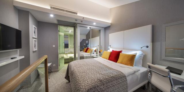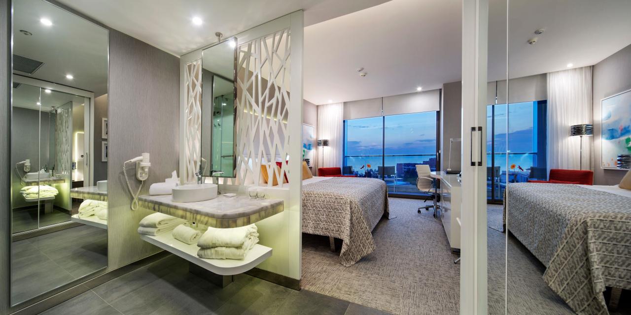 Luxusne zariadené izby sú vybavené balkónom, SAT-TV, klimtizáciou, trezorom, setom na prípravu teplých nápojov, telefónom, minibarom, kúpeľňou s WC, sprchou a fénom. K dispozícii sú aj izby pre hendikepovaných klientov. |